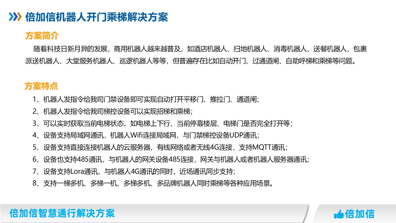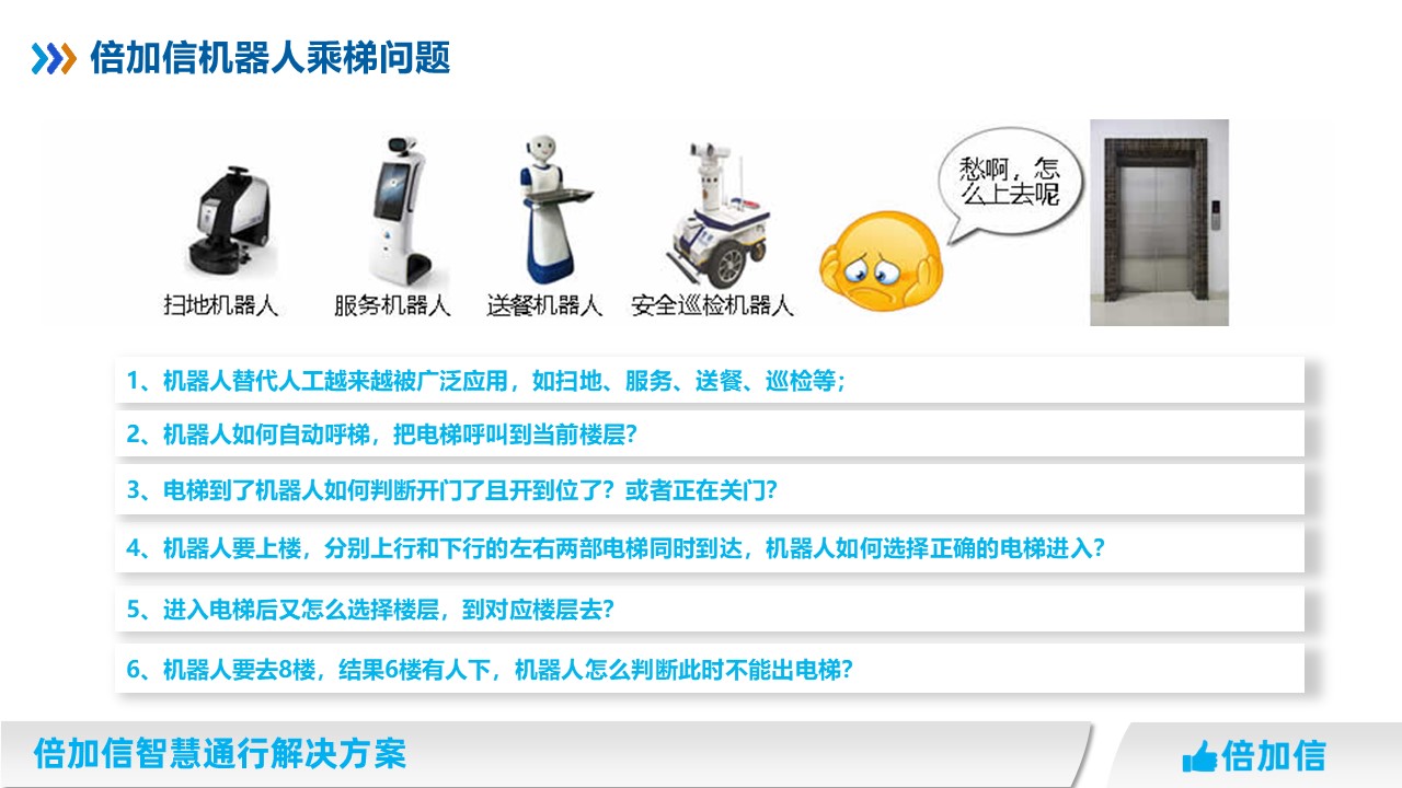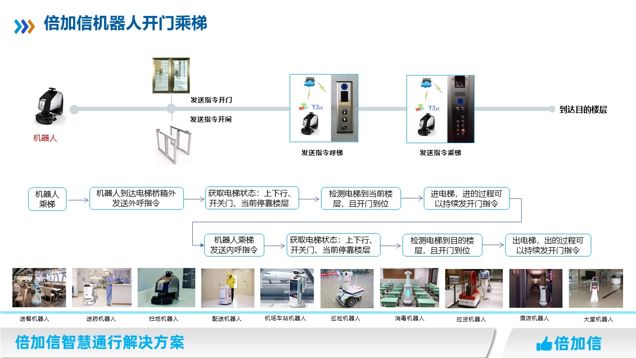 隨著科技日新月異的發展,商用機器人越來越普及,如酒店機器人、掃地機器人、消毒機器人、送餐機器人、包裹派送機器人、大堂服務機器人、巡邏機器人等等,但普遍存在比如自動開門、過通道閘、自助呼梯和乘梯等問題。