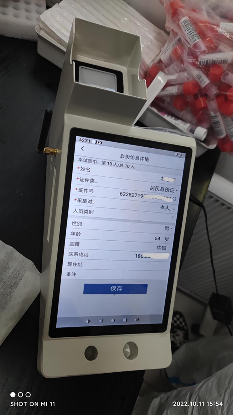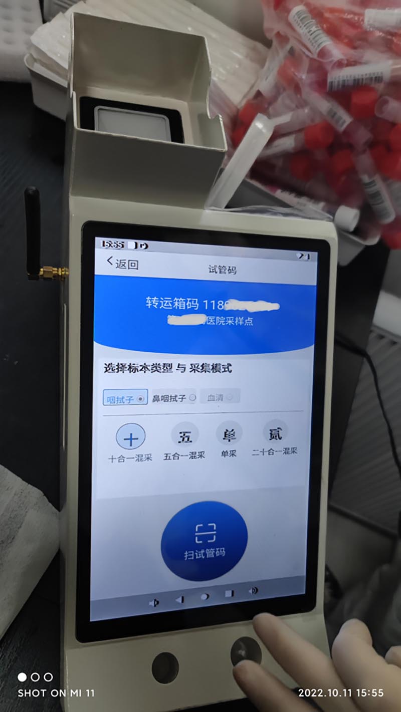 核酸碼采集終端一體機(jī)一般放置在采樣操作的桌面上,也可以固定在采樣窗臺上。進(jìn)行采樣時醫(yī)療人員應(yīng)先根據(jù)采樣任務(wù)(單人單管、五人一管、十人一管、十五人一管或二十人一管)的要求在核酸碼采集終端一體機(jī)上進(jìn)行相對應(yīng)的選擇,然后對試管條碼進(jìn)行掃描;接著受檢人員上前向核酸碼采集終端一體機(jī)出示核酸采樣碼或身份證,核酸碼采集終端一體機(jī)可在一秒內(nèi)完成信息的讀取與上傳;最后由醫(yī)療人員為受檢人員進(jìn)行鼻拭子或咽拭子,在完成既定人數(shù)采樣后,核酸碼采集終端一體機(jī)會自動結(jié)束這管試劑的數(shù)據(jù)錄入并實(shí)時上傳平臺系統(tǒng)。此時,醫(yī)療采樣人員只需要拿出新的試管掃碼即可開啟新管進(jìn)行下一輪采樣。
